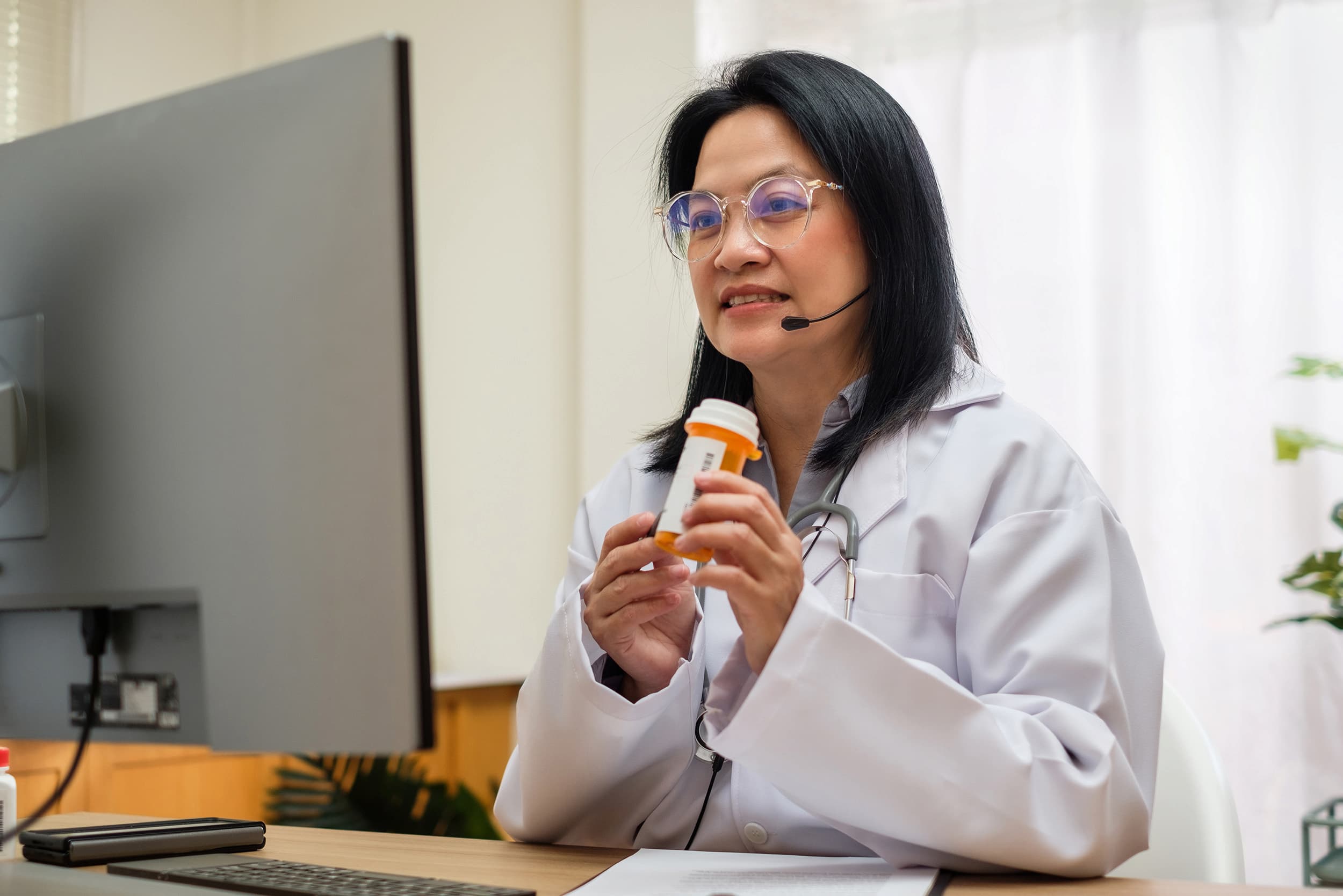 Female doctor on video call holding medication bottle