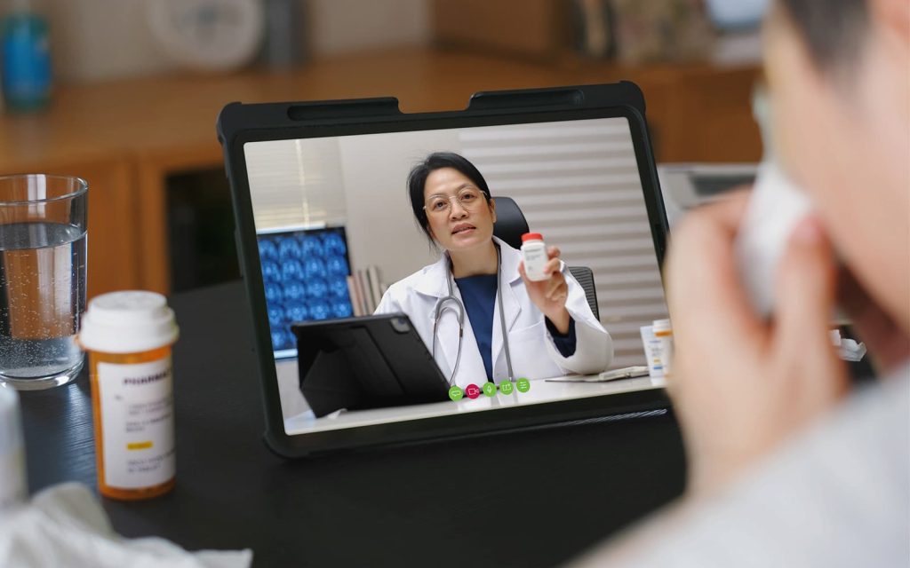 Doctor on video call explaining medication to patient at home