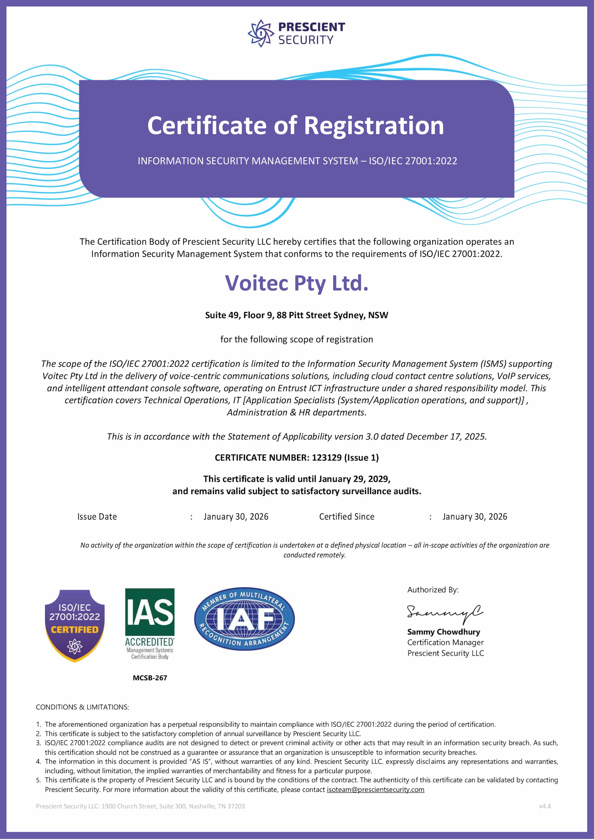 For the System Integrators we support, ISO/IEC 27001:2022 Certification provides valuable assurance. When you engage Voitec to deploy solutions on your behalf, you can confidently communicate to your clients that your technical partner meets internationally recognised security standards.